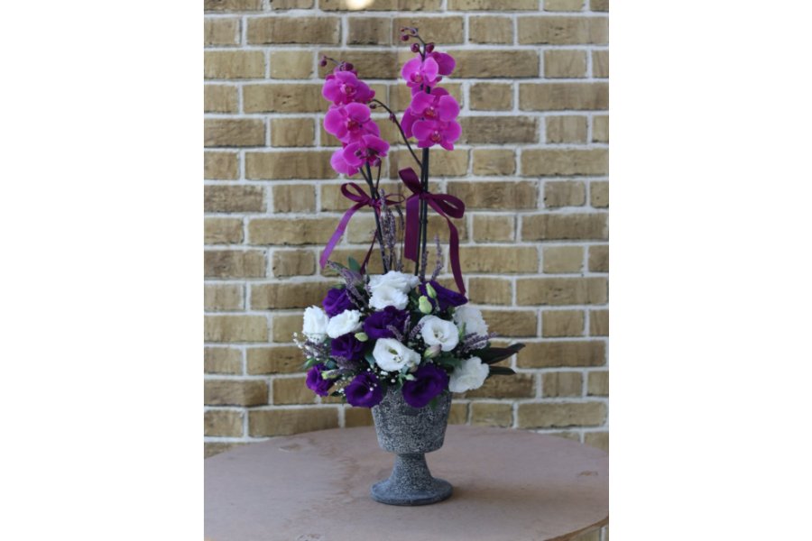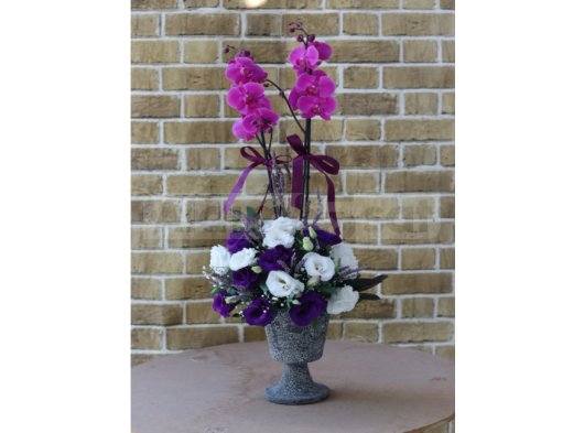 Özel Eskitme Kadeh Seramik Vazo İçinde, Çift Dal Mor Orkide Ve Mevsime Uygun Çiçekler Kullanılarak Yapılan Orkide Aranjmanı